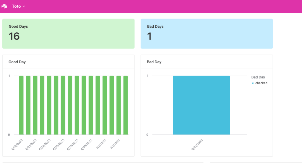 Rather than make the decision from purely an emotional state, I decided to put some of my newfound data analysis knowledge to work. Using Airtable, I built a database, complete with a dashboard, where I could track his health for 30 days and use that as the basis for my decision-making mechanism. If after 30 days, the data showed that he had more bad days than good, then I would euthanize.